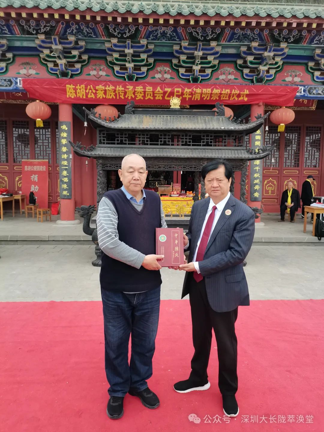4月11日上午九时,深圳萃涣堂理事会成员和莆田玉湖宗亲身着正装,怀着尊祖敬贤之心,郑重地步入了陈胡公陵园,在拜祖大殿前恭恭敬敬的摆上供品,依照家乡大长陇传承数百年的传统礼仪,依次行“二跪六叩首”拜礼。礼成之后,陈胡公研究会的成员热情地带着深圳萃涣堂一行人员,缓缓参观陈胡公陵园,一路上详尽地介绍着园内的建筑、历史与陈氏宗族的悠悠往事,让众人在每一步的行走中,都能真切地触摸到先祖的足迹,感受到血脉传承的温度,进一步加深对陈氏宗族辉煌过往的认知与感悟,这场跨越地域与时间的相聚,不仅是一场对先祖的虔诚祭拜,更是一场凝聚宗亲情感、传承家族文化的深刻之旅。最后两地宗亲互赠族谱书籍和纪念品,合影留念后依依惜别。完成了首站的旅程。